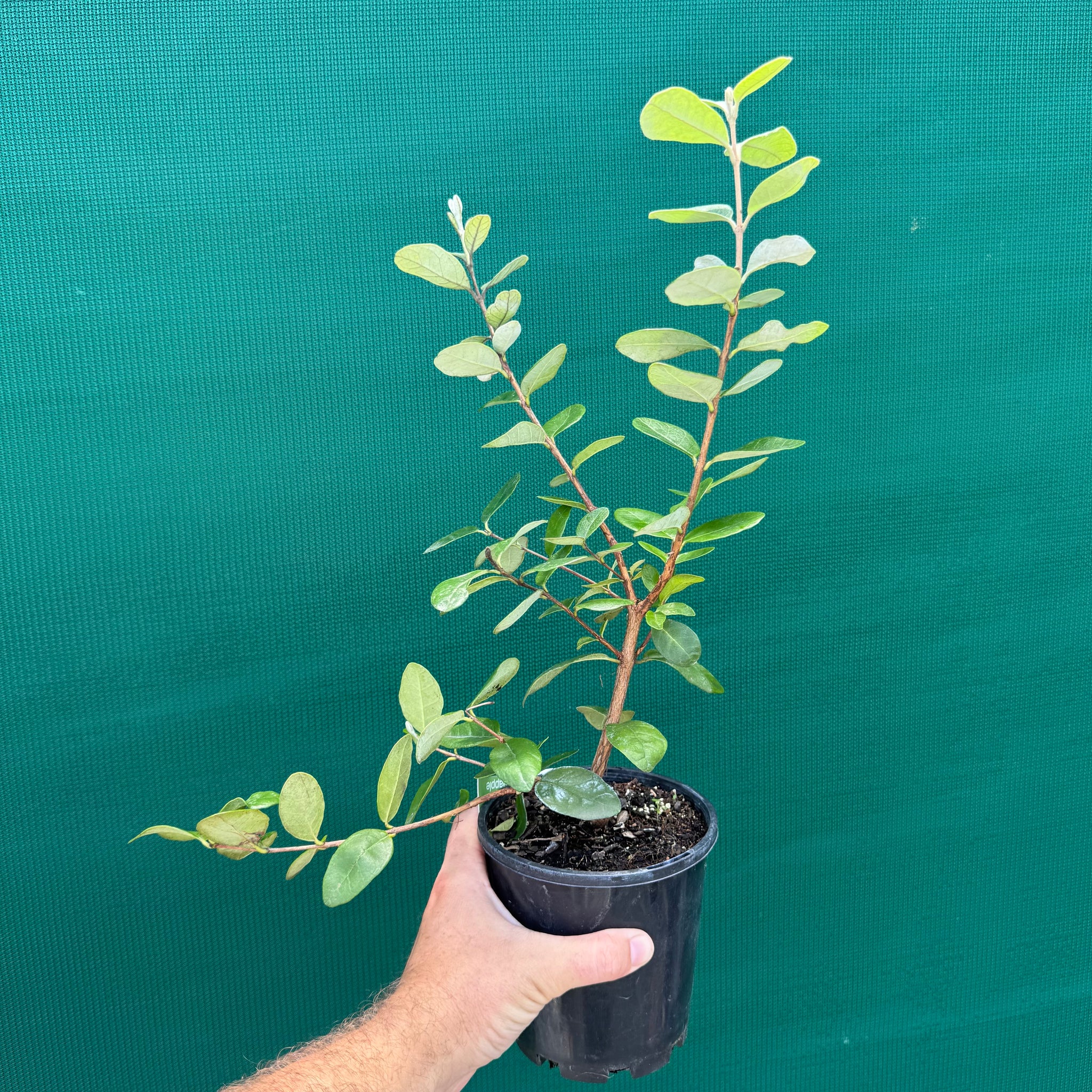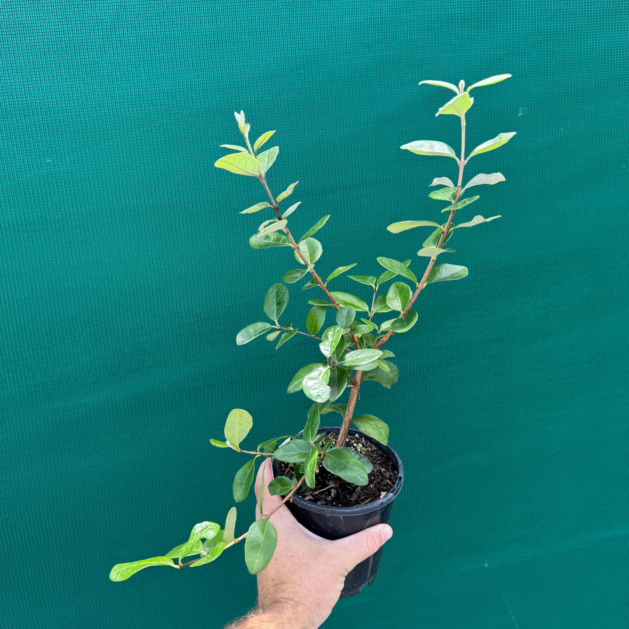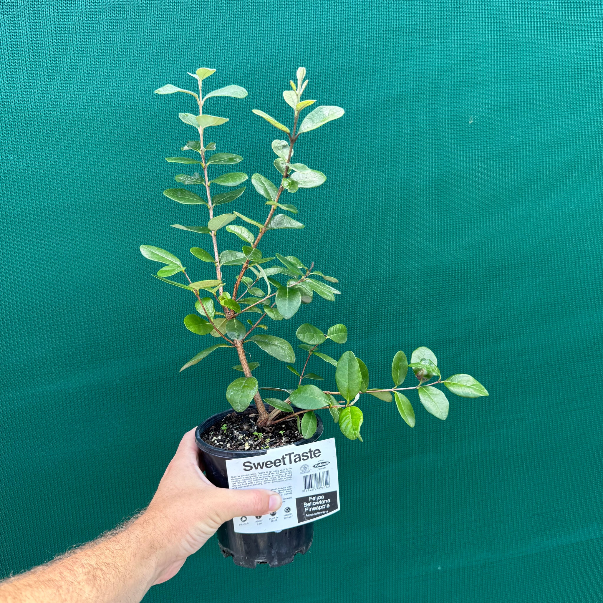 Description: Feijoa ‘Sellowiana Pineapple’ is a hardy, evergreen fruiting shrub or small tree valued for its attractive silvery-green foliage, striking red-and-white edible flowers, and highly aromatic fruit with a distinctive pineapple-guava flavour. Originating from South America, it thrives in subtropical to warm temperate climates and tolerates light frosts once established, making it well suited to many Australian gardens. The oval green fruits ripen in autumn and are best eaten when they naturally fall, revealing fragrant, sweet-tart flesh ideal for fresh eating, desserts, preserves, and smoothies. ‘Sellowiana Pineapple’ prefers full sun to light shade, well-drained soil, and benefits from regular watering during fruit set; it also works well in permaculture systems as a hedge or windbreak, providing food, habitat, and ornamental appeal in one versatile plant.